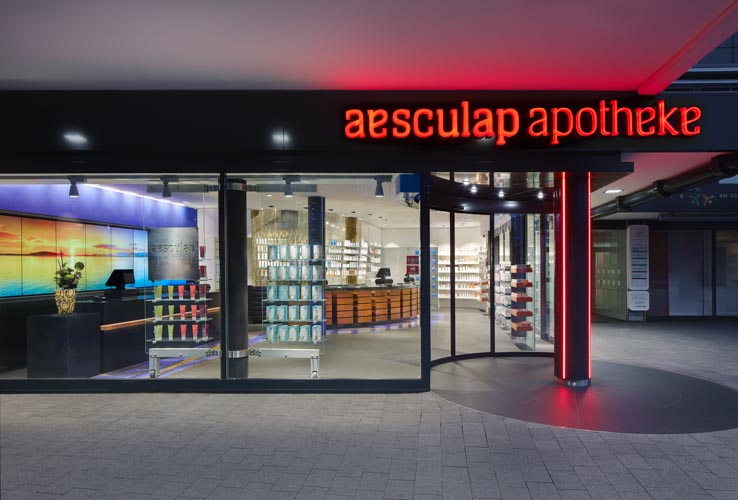 Bei Ecklagen bietet es sich an, den Eingang auf die Ecke zu verlegen wenn beide Seiten vom Zulauf her gleichberechtigt sind. Zudem ergab sich hier die städtebauliche Situation, dass sich der Eingang dadurch genau auf den Vorplatz eines großen Einkaufszentrums auf der gegenüberliegenden Straßenseite ausrichtet. Zuvor gab es zwei Eingänge. Einen mit automatischer Schiebetür und auf der anderen Seite einen unscheinbaren Nebeneingang mit Notdienstanlage. Die gesamte Schaufensteranlage wurde neu erstellt. Die den Eingang markierende, LED beleuchtete Stütze befand sich vorher im inneren des Gebäudes. Mit ihr als Mittelpunkt bildet die im Viertelkreis gebogene Automatiktür ein Rondell aus Granitplatten, das den Eingang markiert. Auch die Leuchtreklame wurde komplett neu gestaltet. Anstelle eines Schriftzuges mit Logo, entschieden wir uns eine Wortmarke zu entwickeln. Dem Designbüro Heine Warneke ist hier mit dem umgedrehten kleinen „a“ als „e“ ein kleiner Geniestreich gelungen und verleiht damit einem simplen Namenszug eine eigenständige Einzigartigkeit.
