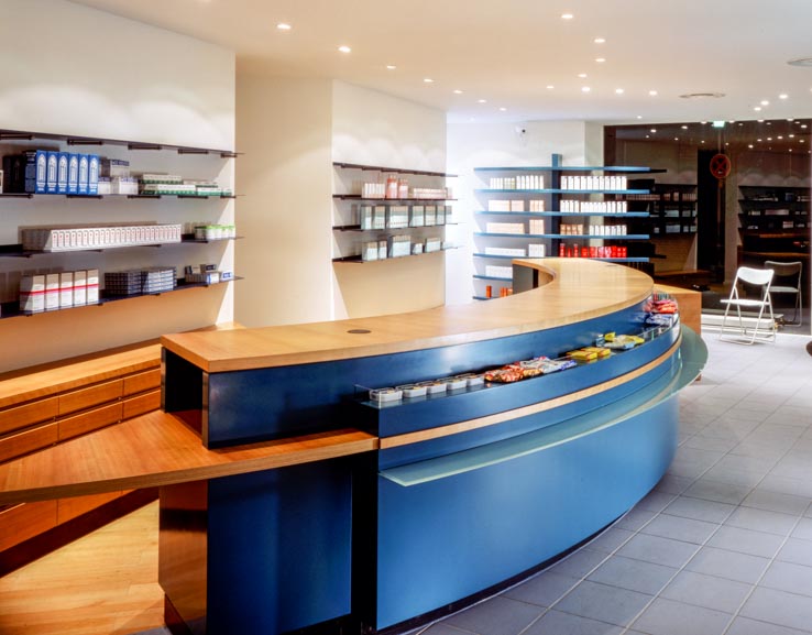 Elefanten Apotheke, Offizin Elefanten Apotheke, Beratungsplatz Elefanten Apotheke, HV-Tisch, Sichtwahl und Freiwahl Elefanten Apotheke, HV-Tisch