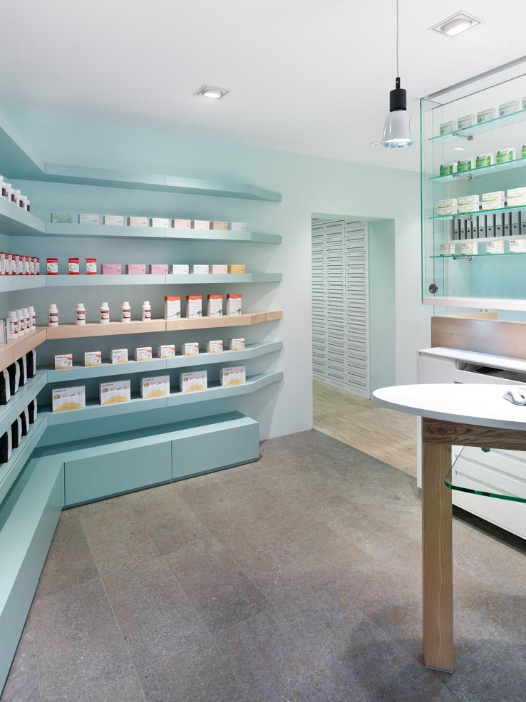 Wie bei kaum einer anderen Apotheke ist hier der Unterschied zwischen vorher und nachher so beeindruckend und wir sind unserem lieben Bauherrn sehr dankbar, dass er dem Mut besessen hat uns diese doch sehr persönlichen Bilder veröffentlichen zu lassen. Die Offizin war vorher gerade mal 21m² groß und ohne den Anbau, der zusätzliche 30m² Spielraum nach hinten geschaffen hat wäre es sehr schwierig geworden. So misst der Verkaufsraum nun stattliche 37m² und ist sogar gefühlte 50m² groß, da die transparente Sichtwahl die dahinter liegenden Arbeitsplätze und die Rezeptur optisch mit einbezieht. Durch die Einzeltische ist der gesamte Raum für den Kunden nutzbar. Die Offizin wird nach hinten hin schmaler. Dies bleibt dem Umstand geschuldet, dass sich hinter der schräg abgewinkelten Freiwahl ein Beratungsraum und der Zugang vom Arbeitsbereich in den Keller befinden wo weitere Lagerräume und ein Labor untergebracht sind. Drei Handverkaufstische wurden an die Sichtwahl angedockt. Hier befindet sich auch der räumliche Beratungsschwerpunkt. Der zum Schaufenster hin erste HV-Tisch wurde als Sitzplatz gestaltet, die beiden Anderen als Stehplätze. Ein weiterer Schnell-HV befindet sich in der Freiwahl an der Glasschiebetür zum Beratungsraum. Die hinter der gläsernen Sichtwahl liegenden Arbeitsplätze ermöglichen ständigen Blickkontakt mit dem Verkaufsraum, wodurch sich zu Stoßzeiten das Kundenaufkommen flexibler bewältigen lässt. Klingelknopf und Kamera zum Backoffice sind hier nicht nötig. Um zu zeigen, dass sich in dieser Apotheke noch richtig etwas tut, wurde die Rezeptur in Verlängerung der Arbeitsplätze hinter der Sichtwahl direkt ins Schaufenster platziert. Im Durchgang von der Offizin zu den hinteren Arbeitsplätzen und die Warenwirtschaft befinden sich 14 Schubsäulen. Durch den Namen "Engel-Apotheke" inspiriert sollte die Einrichtung eine ätherisch flüchtige Farbgebung bekommen die in dem kleinen Raum zusätzliche Weite suggerieren soll. Helles, naturbelassenes Eschenholz unterstreicht mit seinem Bio-Charakter die anthroposophische Ausrichtung und ein traumhafter Natursteinboden aus Muschelkalk erdet das Gesamtbild.